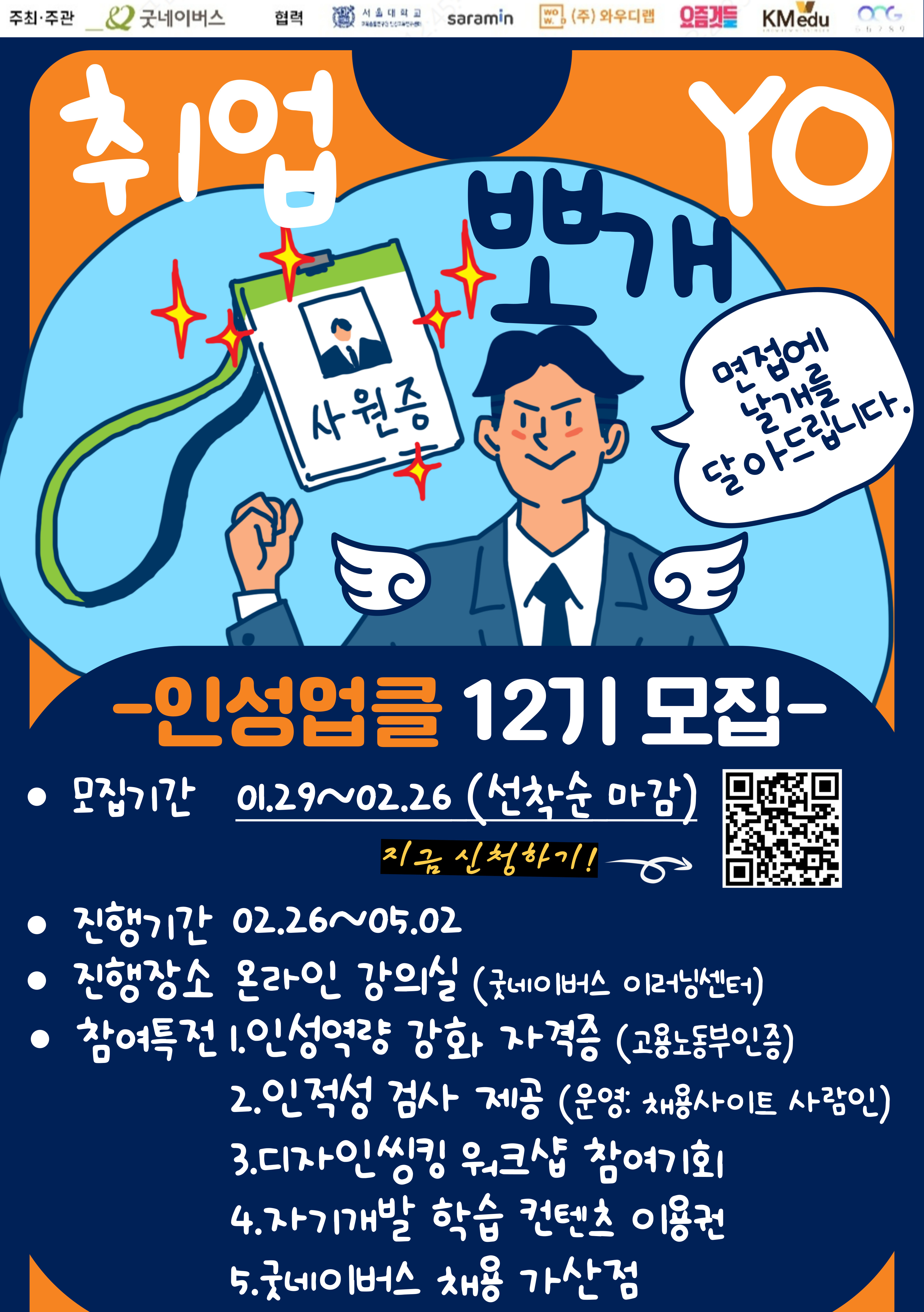 외부채용 굿네이버스 미취업 청년 인성역량 강화 자격증 과정 12기 참여자 모집 안내 작성자 대학일자리플러스센터 작성일 2025-02-10 13:52 조회 310 ⯈자세한 사항은 붙임을 참고해 주시기 바랍니다. 인쇄 붙임-교육안내문.pdf « 2025년 제1기 행정안전부 국가재난안전교육원 청년인턴 채용 안내 인제대학교 정규직 직원(2명/분야별 1명) 신규채용 안내 » 목록보기 Powered by KBoard