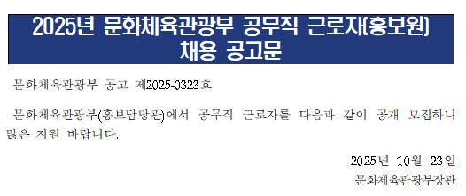 외부채용 문화체육관광부_2025년 공무직 근로자(홍보원) 채용 안내 작성자 대학일자리플러스센터 작성일 2025-11-03 14:37 조회 164 채용 홈페이지 https://mcst.go.kr/site/s_notice/notice/jobList.jsp 인쇄 문화체육관광부-공무직홍보원-근로자-채용-공고문.hwp « 울산교육청_2026년 교육공무직 공개경쟁시험 공고 안내 용인도시공사_2025년 제4회 청년 체험형 인턴 공개채용 안내 » 목록보기 Powered by KBoard