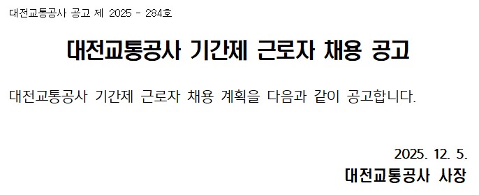 외부채용 대전교통공사_기간제 근로자(시스템엔지니어링) 채용 공고 안내 작성자 대학일자리플러스센터 작성일 2025-12-10 14:26 조회 105 채용 홈페이지 https://www.djtc.kr/kor/index.do 인쇄 대전교통공사-공고-제-2025-284호_기간제근로자-채용-공고문.hwp « 충남대학교병원(대전)_2025년도 신규간호사(면허 취득 예정자) 공개채용 모집공고 안내 2026 상반기 중앙선거관리위원회 사이버공정선거지원단 모집 안내 » 목록보기 Powered by KBoard