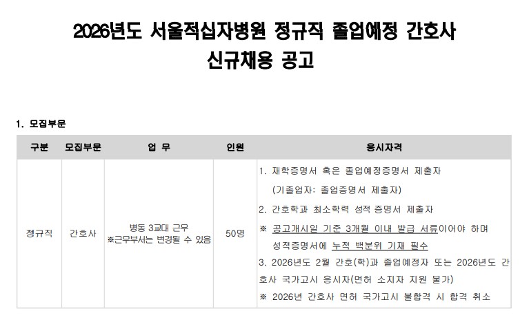 외부채용 서울적십자병원_2026년도 정규직 졸업예정 간호사 신규채용 공고 안내 작성자 대학일자리플러스센터 작성일 2025-12-12 11:34 조회 86 채용 홈페이지 https://www.rch.or.kr/web/rchseoul/main 인쇄 채용공고문2026년도-정규직-졸업예정-간호사.pdf « 2026 상반기 중앙선거관리위원회 사이버공정선거지원단 모집 안내 한국사회복지관협회_사무원(정규직) 채용 공고문 안내 » 목록보기 Powered by KBoard