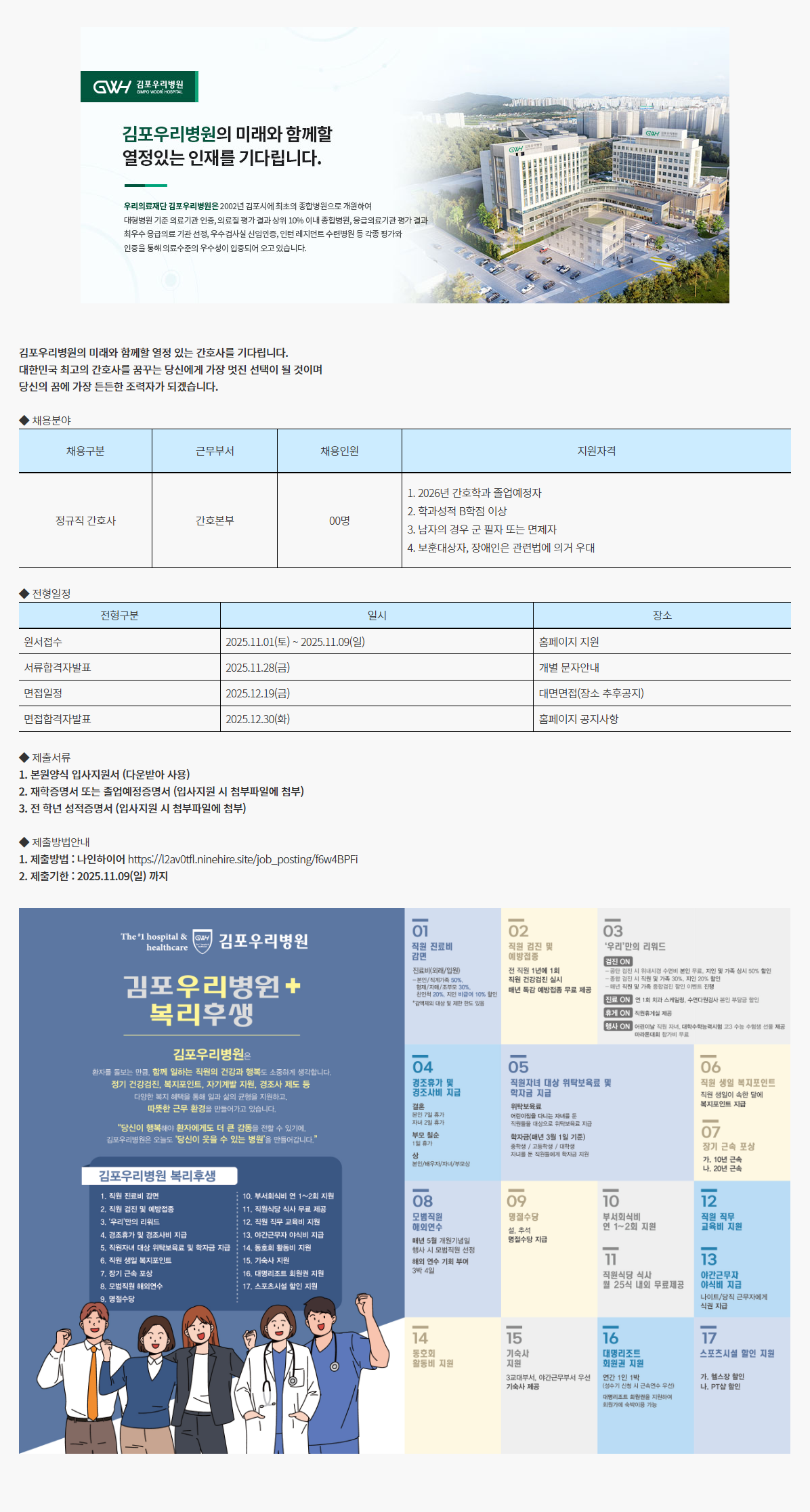 외부채용 김포우리병원_2026년 신규간호사(졸업예정자) 채용공고 안내 작성자 대학일자리플러스센터 작성일 2025-11-06 13:31 조회 312 채용 홈페이지 https://www.gwhospital.co.kr/main/ 인쇄 « 부산성모병원_2026년 신규간호사(졸업예정자) 모집 안내 케이워터운영관리(주)_신규인력 채용 안내 » 목록보기 Powered by KBoard